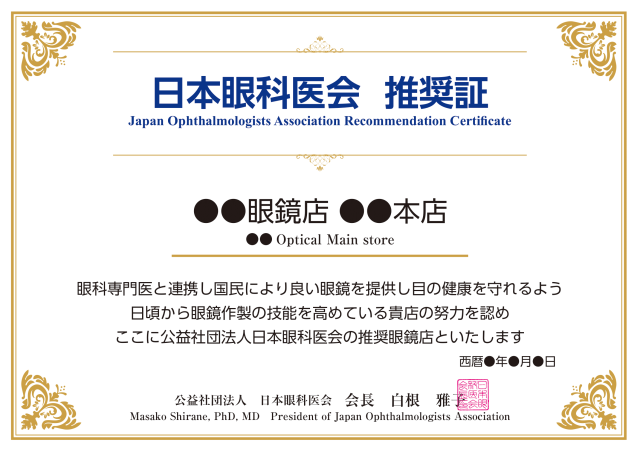 日本眼科医会による信頼できる眼鏡店の認定を通して、眼科専門医と眼鏡作製技能士の在籍する眼鏡店との連携を強化することにより、眼鏡作製技能士の資格取得及び眼鏡店への配置の促進と眼鏡作製技能士の技能、資質及び倫理の一層の向上を図るとともに、眼科医療機関(眼科専門医)の眼鏡処方箋に基づく高品質で眼科学的に適切な眼鏡の提供を拡充し、国民の目の健康と眼鏡の快適な利用を促進することを目的とする。