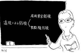 | 医師 | 遠視によっておこる弱視には、二種類あります。両目の遠視が同じ程度の屈折異常弱視と、遠視の程度が左右で異なり、遠視が強い方の目におこる不同視弱視があります。 このほかに、遠視以外の原因による弱視として、斜視におこる斜視弱視や、眼帯などで目をふさいだためにおこる遮蔽弱視があります。 |